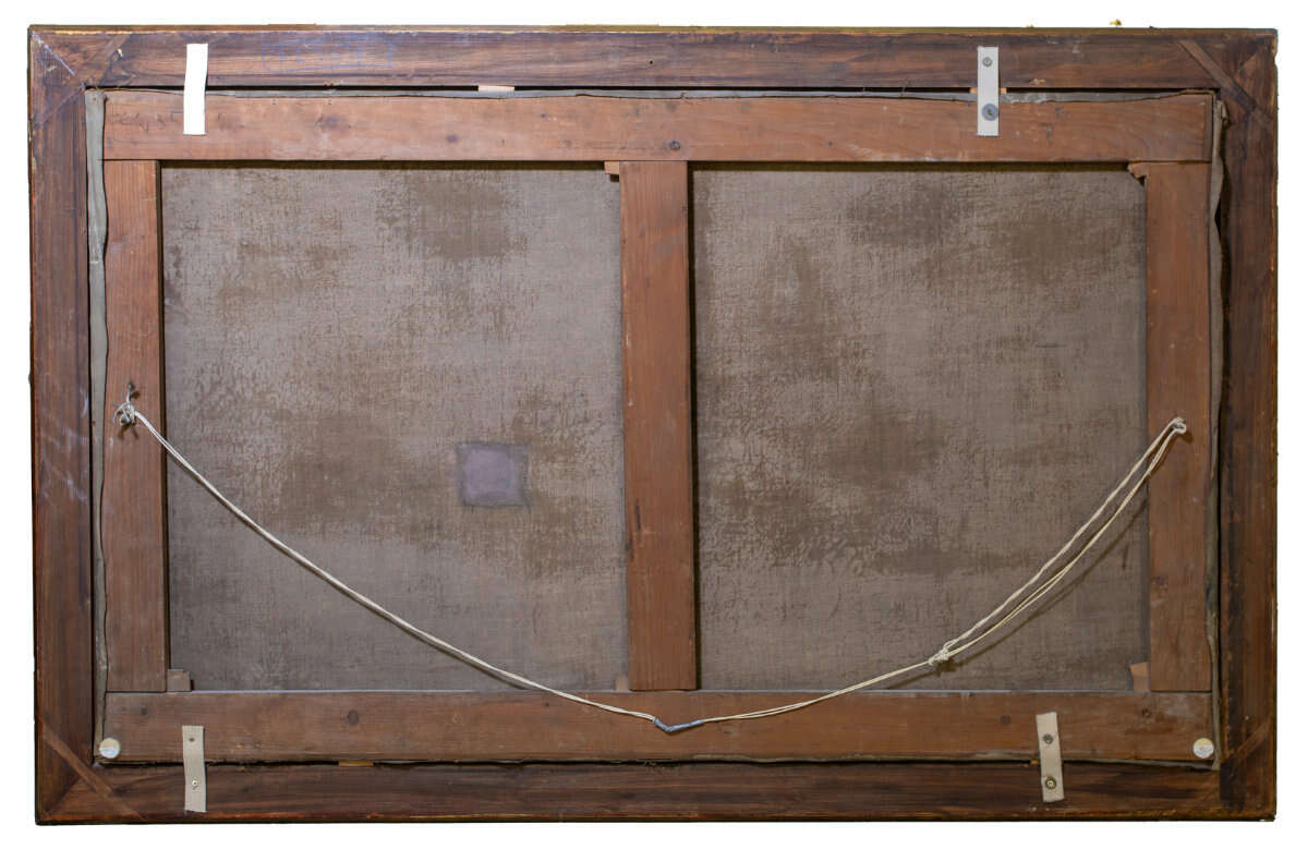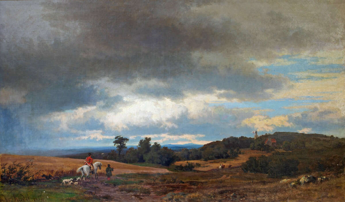 Hunting party in an open landscape, oil on canvas, 75 × 125 cm visible dimensions, signed, dated 1859, restored area on the canvas, mounted