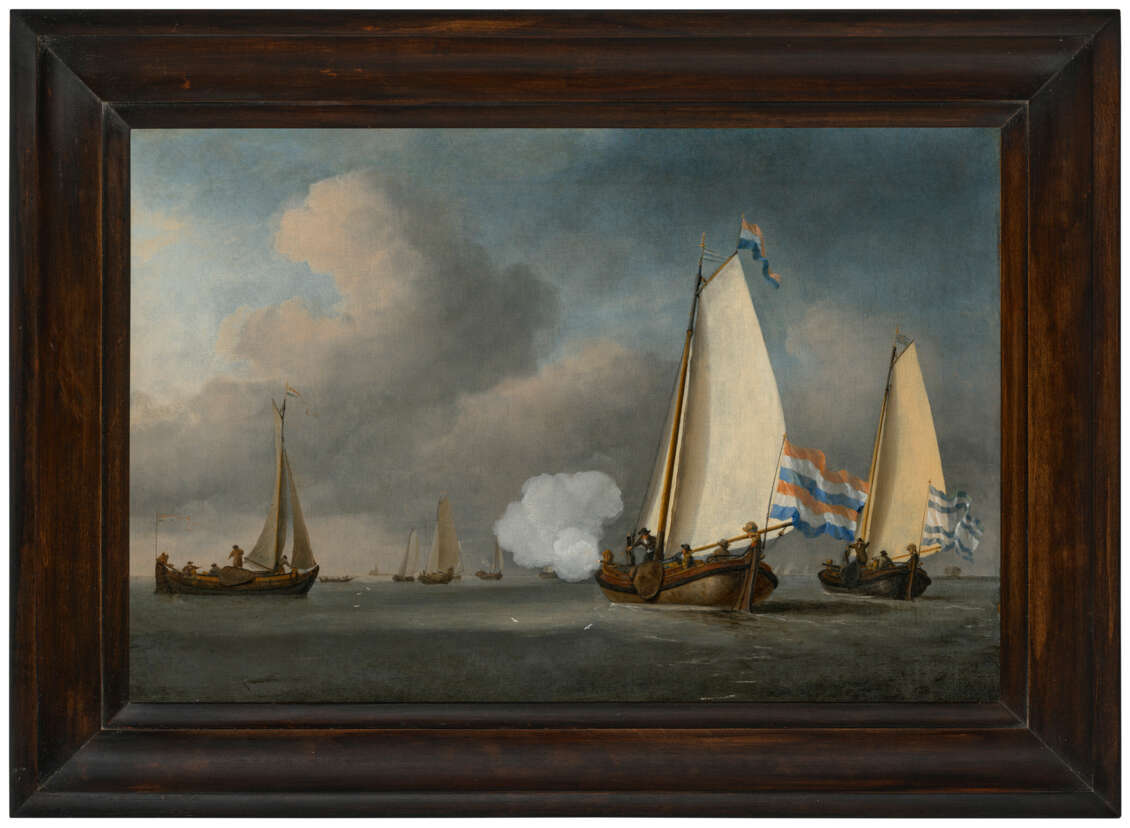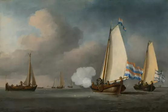 A calm with two boeier yachts, one firing a salute