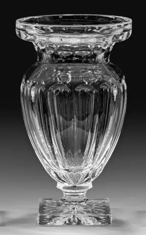 in Form eines antiken Kraters. Schweres Kristallglas, geschliffen und poliert. Modellreihe "Windsor". Herstelleretikett. H. 30,5 cm.