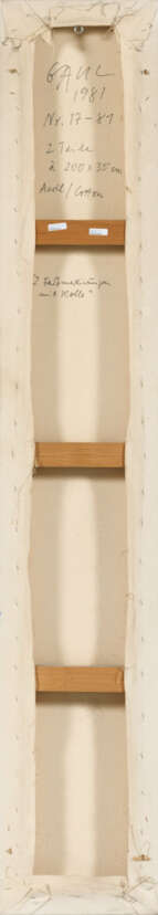 Notation: Signed, dated, inscribed and titled verso: GAUL 1981 Nr. 17-81 2 Teile à 200 x 35 Acryl/Cotton "2 Farbmarkierungen mit Rolle".