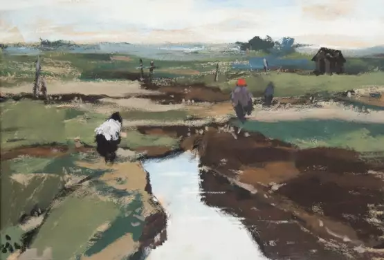 Лот 11 | Wittler, Heinz (Heinrich Arrigo Franz Wittler 1918-2004) "Bäuerin in Moorlandschaft", Öl/ Hartfaser, monogr. u.l., 45,5x65,5 cm, Rahmen