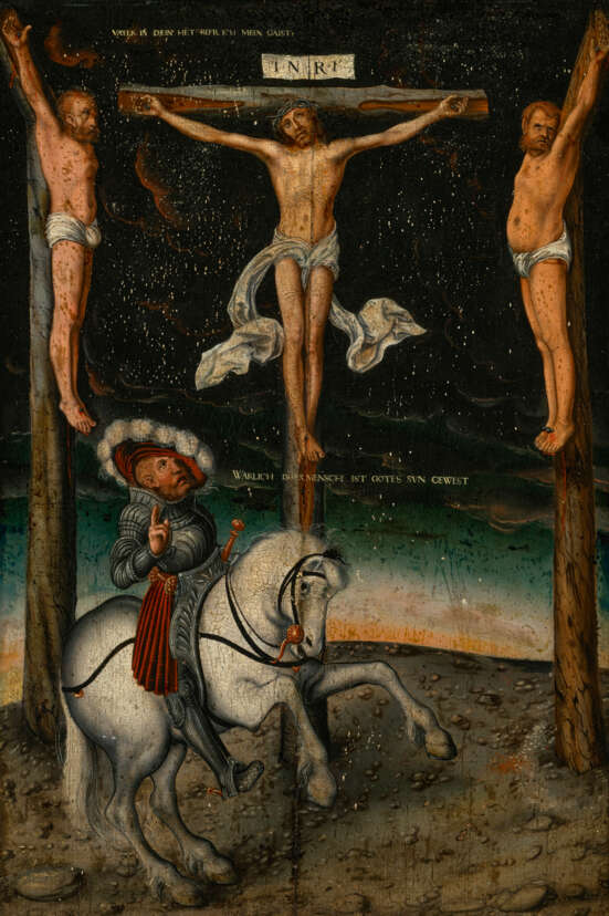 inscribed 'VATER IN DEIN HET BEFIL ICH MEIN GAIST' (upper left); and 'WARLICH DIESER MENSCH IST GOTES SVN GEWEST' (centre)