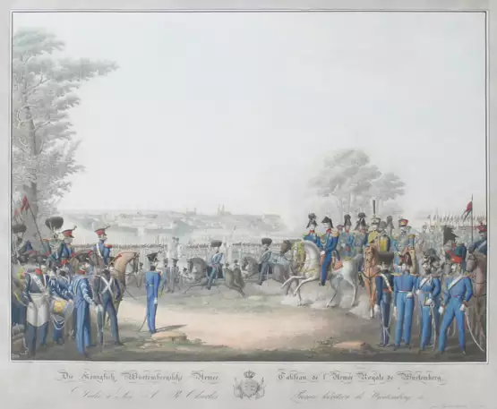 Darstellung einer Truppenschau der württembergischen Armee. Sehr guter Zustand. - The Royal Württemberg Army. Old coloured outline etching, framed under glass, signed in the plate.