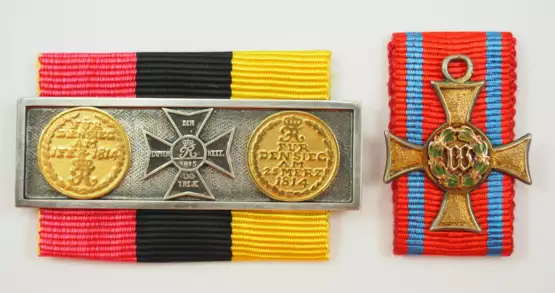 Anbei ein wohl später gefertigtes dreiteiliges Barett mit der Goldenen Ehrenmedaille für den Sieg bei Brienne, 1. Febr. 1814 / Silbernes Ehrenzeichen für den Feldzug von 1815 / Goldene Ehrenmedaille für den Sieg bei La Fére Champenoise, 25. März 1814, mit eingeschlauftem Band. Dazu weitere Miniaturbänder.