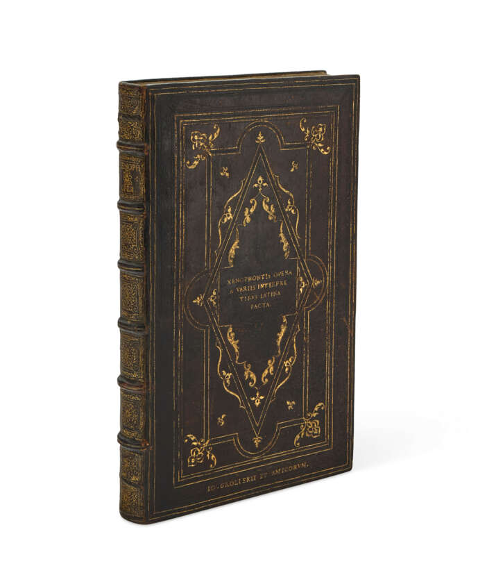 The Mac Carthy Reagh-Syston Park-Hollins-Schiff copy of Xenophon's works, bound by Jean Picard for Jean Grolier and handsomely printed by Cratander's humanist press in Switzerland. Translators for this edition include Erasmus and Willibald Pirckheimer. This was one of nine Grolier bindings owned by Phyllis Goodhart Gordan. Bookbindings from the Library of Jean Grolier, xvi-xvii; Hobson Renaissance Book Collecting, Appendix I.iv.c; Le Roux de Lincy 349; Portalis and Shipman 555; USTC 606415.