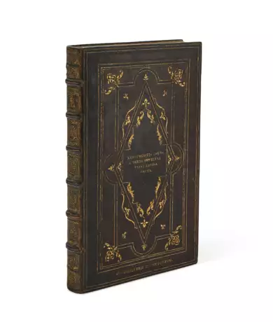 Folio (323 × 200mm). 4-part woodcut border and historiated initial opening text, historiated woodcut initials, printer’s device on title and final verso (minor loss at edge lower corner in final quire, faint dampstain in 2 fore-margins). Bound for Jean Grolier by Jean Picard: contemporary Parisian calf over thin pasteboard tooled in gold with BM tools 1, 8b, 10, 12, 16, and others, upper cover lettered with title at center and Grolier’s ‘et amicorum’ motto at foot (IO. GROLIERII ET AMCORUM., lower cover letter with Grolier’s motto at center, gilt edges, later spine tooled in gilt with rosettes (rebacked in the 17th century, leather lightly crackling and rubbed); 20th-century brown morocco slipcase, chemise. Provenance: Le Comte de Mac Carthy-Reagh, 1744-1811 (Catalogue des livres rares et précieux de la bibliothèque de feu M. le comte de Mac-Carthy Reagh, 1815, no. 4302) – Sir John Hayford-Thorold, Syston Park Library, 1773-1831 (his sale, Sotheby, Wilkinson & Hodge, 12 December 1884, lot 2103; to Quaritch) – Répertoire méthodique de la librairie Damascène Morgand, 1893, no. 6432 – Jacques Rosenthal, 1854-1937, Munich bookseller, Literarische Seltenheiten aus allen Gebieten, catalogue 29, no. 1083 – Mrs. Henry B. Hollins (her sale, Anderson Galleries, 12-13 January 1915, lot 317) – Mortimer L. Schiff, 1877-1931 (red leather label; his sale, Sotheby's, 9 December 1938, lot 2478; to Maggs) – Howard Lehman Goodhart (1884–1952; label; gifted to his daughter:) – Phyllis Goodhart Gordan (1913–1994; leather label); by descent.