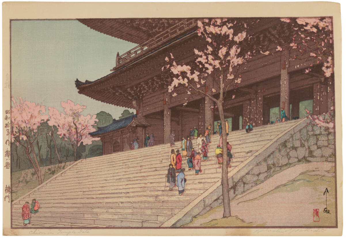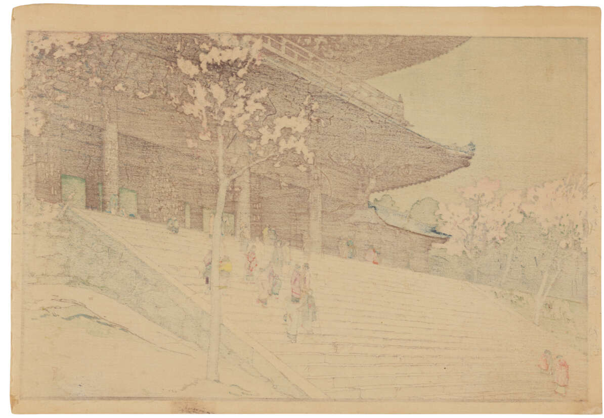 1) Romon (Chion’in Temple gate), from the series Sakura hachidai (Eight scenes of cherry blossoms), signed Yoshida, with a jizuri (self-printed) seal, dated 1935