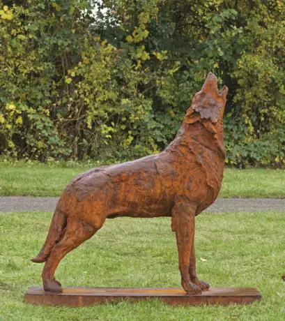 Gusseisen, rostbraun patiniert. Große, vollplastische Darstellung eines aufheulenden Wolfs. H. 128 cm.