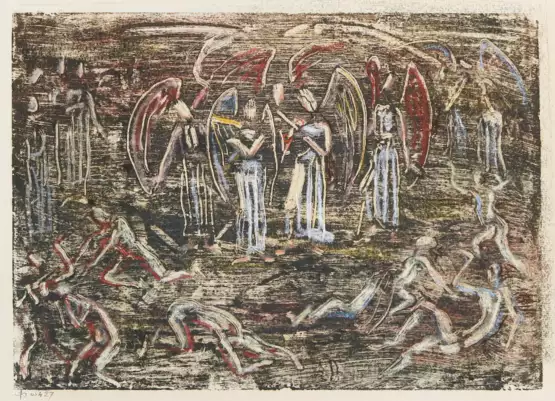 (1891 Pforzheim 1992). Akte u. Engel. Farbmonotypie mit Pastellkreide überarbeitet. Blgr. 38 x 51 cm. Unt. li. monogr. u. mit Werknummerierung "W 427". - Leichte Gebrauchssp.
