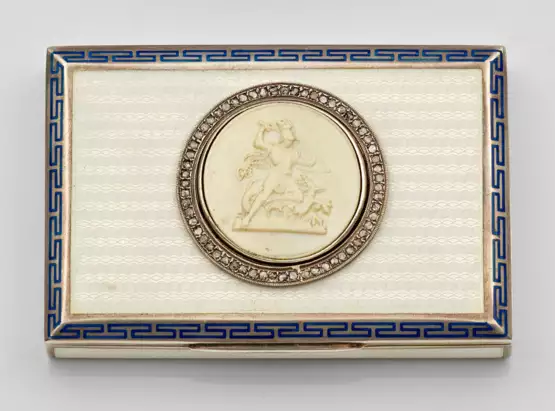 im Stil von Karl Fabergé. Silber, teilw. emailliert. Rechteckig mit leicht aufgewölbten Scharnierdeckel, gerahmt mit blauem Mäanderband und zentral besetzt mit Bakelit-Applikation des Hl. Georgs, gerahmt von Silberband, ausgefasst mit Diamantrosen. Deckel, Wandung und Boden weiß emailliert über wellenbandförmig guillochiertem Grund. Gest. 88. Gew. ca. 180 g. H. 2 cm. 9 cm x 6 cm.