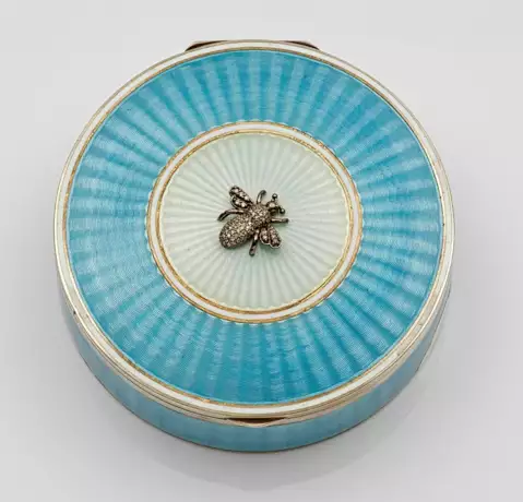 im Stil von Karl Fabergé. Silber, teilw. emailliert. Runder Korpus, leicht aufgewölbter Scharnierdeckel. Deckel und Wandung wellenförmig guillochiert und himmelblau bzw. weiß emailliert. Auf dem Deckel appliziert eine mit kleinen Diamantrosen ausgefasste Biene. Innen vergoldet. Gest. 935, unbekanntes Herstellerzeichen. Gew. ca. 190 g. H. 3 cm. D. 9 cm.