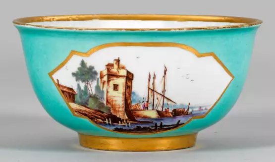 Auf kurzem Standring runder, leicht gebauchter, sich konisch erweiternder Korpus mit leicht ausschwingendem Rand. Beidseitig der Wandung in zartem Türkisfond ausgesparte, goldkonturierte Vierpassreserve. Darin Kauffahrteiszene mit an Flußufern angelegten Segelschiffen vor teilw. bergiger Landschaftskulisse mit großen Architekturen sowie Figurenstaffage. Im Spiegel der Kumme in eisenroter Doppelringlinie gerahmtes Medaillon mit korrespondierender Darstellung. Unw. rest.; Schwertermarke. H. 8 cm. D. 16,5 cm.