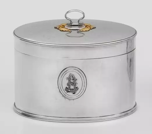 im Stil von Karl Fabergé. Silber, teilw. vergoldet und mit kleinen Diamantrosen besetzt. Hoher Korpus auf ovaler Grundfläche. Scharnierter Deckel mit beweglichem Knauf. Schauseitig auf Wandung ovale Monogrammkartusche. Gest. 84. Gew. ca. 315 g. H. 11 cm. 13,5 cm x 7 cm.