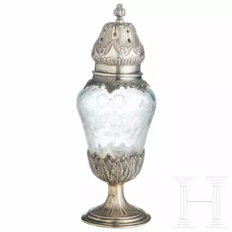 Farbloses, schliffverziertes Glas: Schleifen mit Blumengirlanden. Silbermontur, partiell vergoldet. Wandungsansatz mit reliefiertem Blütenansatz. Schraubbarer Streuaufsatz mit plastischem Knauf. Fuß und Aufsatz punziert mit Beschaumarke und Meistermarke "HO". Höhe 18 cm.