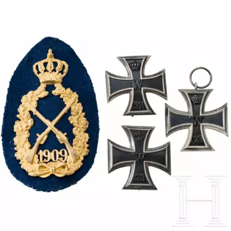 Eines in konvexer und eines in flacher Ausführung, jeweils mit geschwärztem Eisenkern in Silberzarge. Dazu ein EK 2 und ein bayerischer Königspreis für Schützen von 1909.