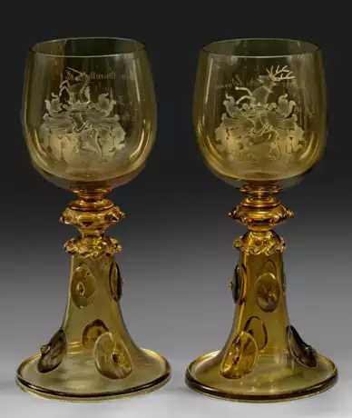 Grünes Glas mit Schnittdekor. Trompetenförmiger Fuß mit aufgelegten Nuppen und gekniffenem Zierring. Auf der Kuppa fein geschnittene unterschiedliche Verbindungs-Vollwappen, auf der Gegenseite Widmungsinschrift mit Ausstellern (v. Borcke, v. Guenther) und jeweiligem Empfänger (s/l. G. v. Döbbecke) sowie verschiedenen Zirkeln und Datierung 1897 und 1898. H. 28,2 cm.