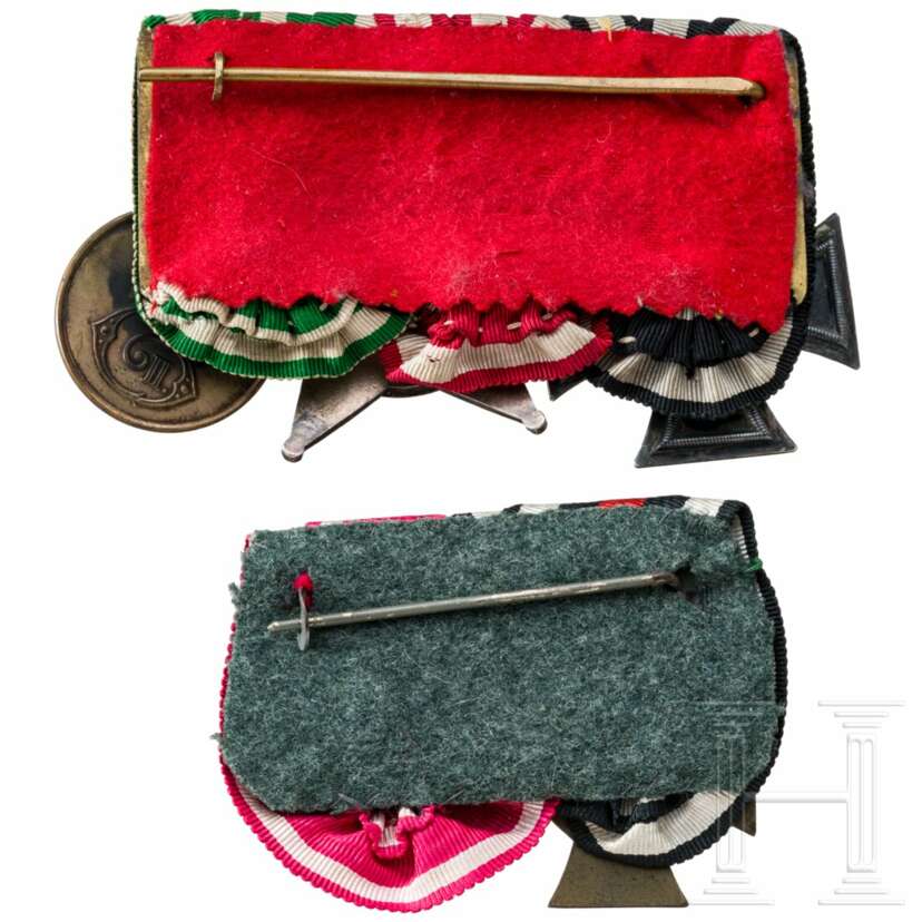 Dreiteilige Schnalle mit EK 1914, 2. Klasse, Eisernem Halbmond (silberner Stern, mehrteilig gefertigt, schauseitig rot emailliert, Rs. Quernadel, Breite 57 mm) und bronzener Tapferkeitsmedaille 1914 Sachsen- Altenburg, Rs. vernähtes rotes Tuch und Quernadel aus Buntmetall. Dazu eine zweiteilige Schnalle mit Frontkämpfer-Ehrenkreuz aus bronziertem Eisen ("G 6") und rot emaillierter Miniatur des Eisernen Halbmondes (Breite 14 mm), Rs. vernähtes feldgraues Tuch und Quernadel aus Eisen. Trage- und Altersspuren.