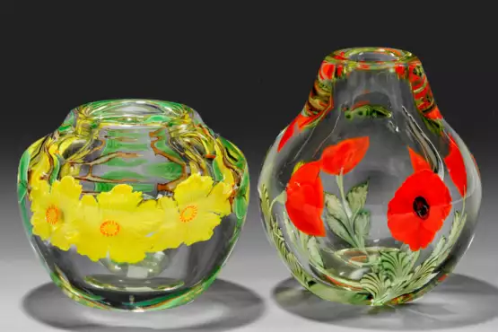 Farbloses Glas. Blumen-Einschlüsse in Grün, Rot, Gelb und Schwarz. Sign. "M.Quinn" und "G.Held", betitelt "Orient & Flume", nummeriert "0038V10F6019" und "0063V8OF0621y". H. 9 cm - 11,5 cm.