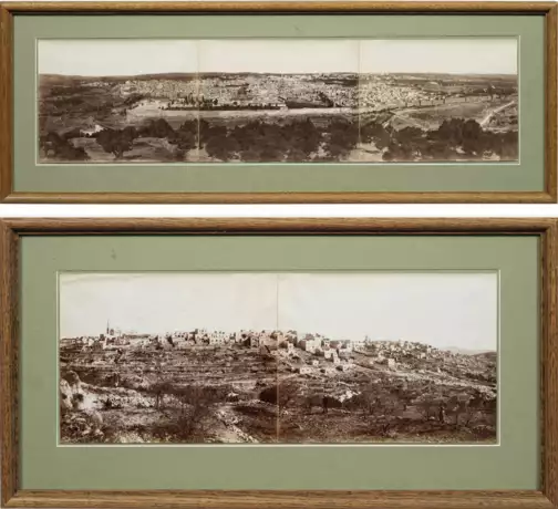 Two panoramic views of Jerusalem (three-part) and Nazareth (two-part), albumin prints, circa 1880-1900. One print signed "Bonfils" and numbered "300" in the negative.