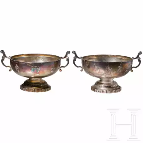 Silber. Jeweils runder, geschweifter Fuß. Eine Schale mit reliefierten Herzen und Lilie, auf der Wandung spätere Gravur "DE MAILLY 1744". Im Spiegel eingelegte Medaille "PHILIPPUS DUX AURELIANENS", rückseitig Ludwig XV. und Peter, der Große. Die zweite Schale mit reliefierten Weinranken sowie späterer Gravur "E.F. de DURAS 1757". Im Spiegel eingelegte Medaille Ludwig XV. Der Fuß und die Wandung punziert mit Beschaumarke, Jahresbuchstabe "R", Pächterstempel Hubert Louvet und Florent Solliert sowie Meistermarke. Maße jeweils 10 x 17,5 cm, Gesamtgewicht 638 g.