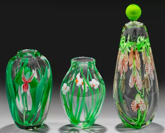 Farbloses Glas. Blumen-Einschlüsse in Grün, Bordeaux, Orange, Weiß und Pink. Sign. "Walkoft" und dat. "1983" sowie "S. Beyers", betitelt "Orient & Flume" und nummeriert "0017W60F626". H. 13 cm - 23,5 cm.