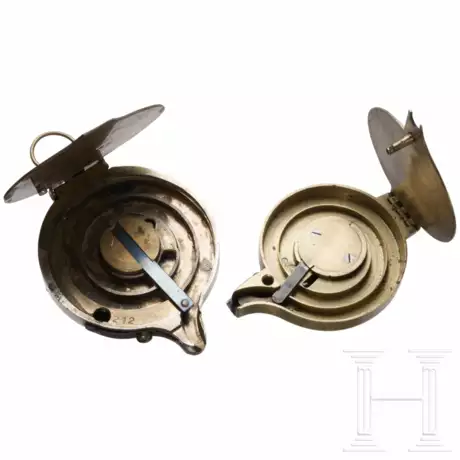 Unterschiedliche runde Exemplare aus Messing, das größere zum Teil vernickelt. Aufklappbare Konstruktion mit gefederter Aufnahme für Zündhütchen. Jeweils mit beweglicher Trageöse. Größe 8,5 und 7 cm.