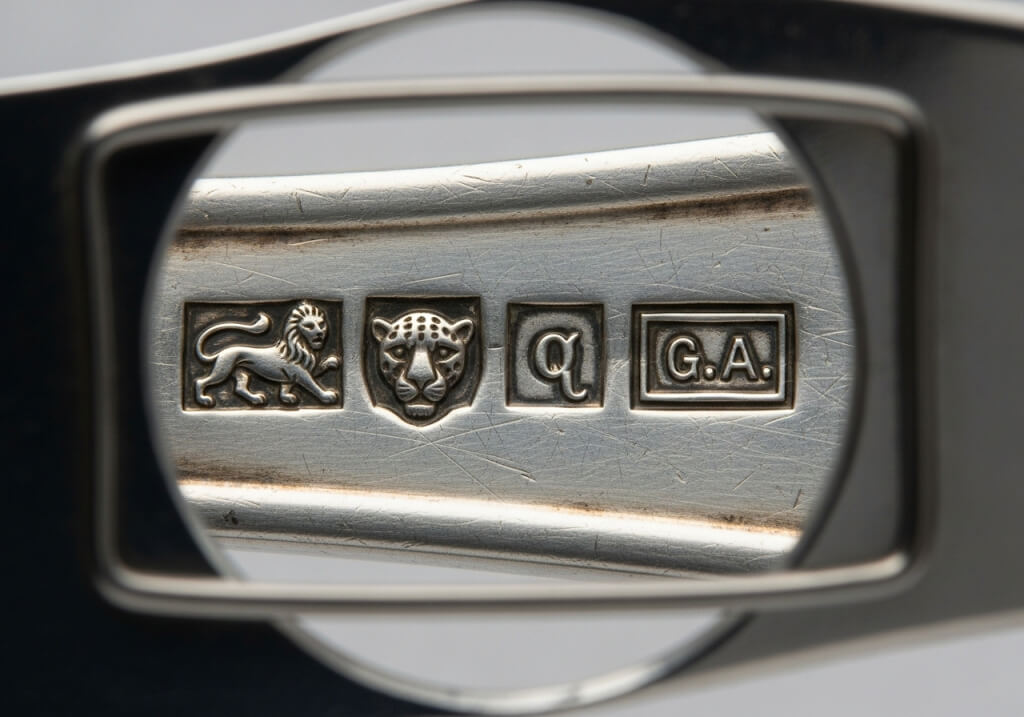 Клеймо города: Указывает на город, где предмет прошел проверку в пробирной палате. Самые известные: голова леопарда (Лондон), якорь (Бирмингем), корона (Шеффилд).